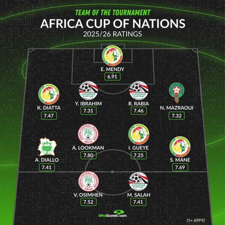 开云APP-whoscored非洲杯最佳阵:马内领衔塞内加尔4将 萨拉赫奥斯梅恩在列