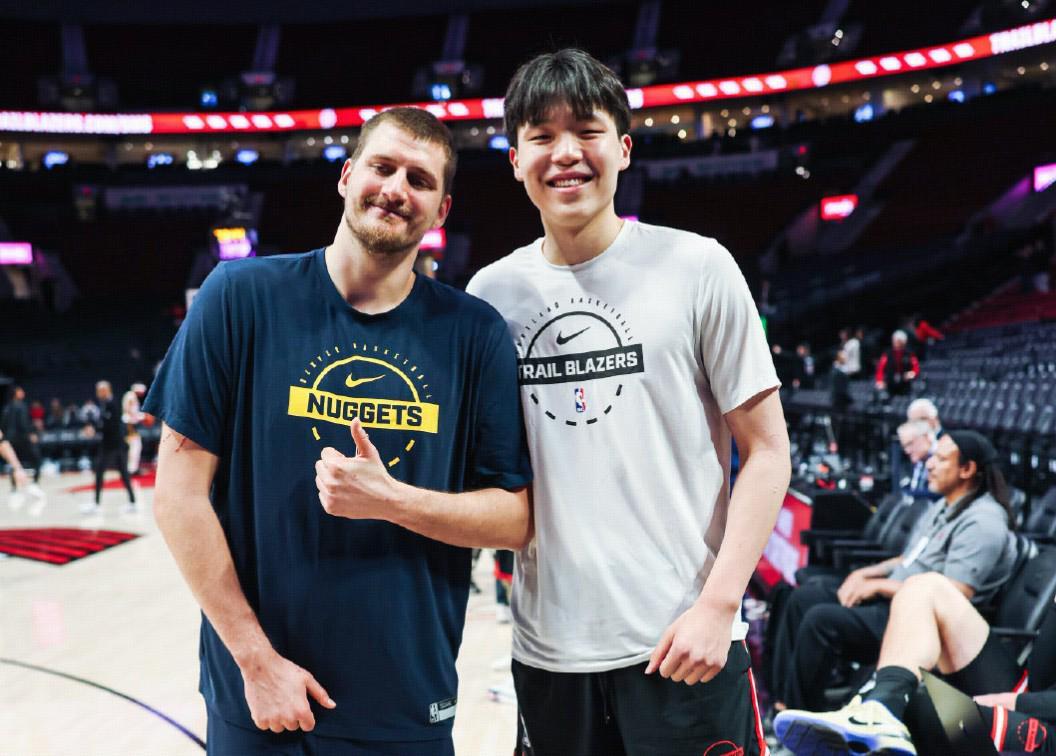 本场比赛赛前,开拓者新秀杨瀚森与自己的偶像——掘金球星约基奇进行了交流互动,并合影留念。