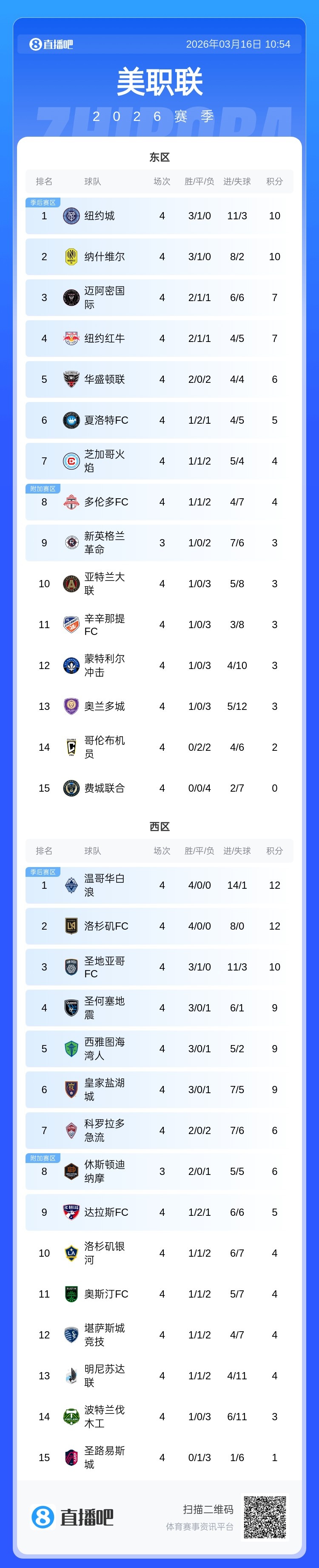 温哥华白浪在新赛季美职联前4轮取得全胜,打进14球仅丢1球,目前在西区积分榜位居榜首。